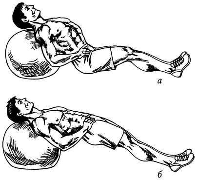 Готовим разгибатели позвоночника к изометрической работе. Лягте на фитбол, руки на поясе (рис. 29, а). Опираясь на мяч верхом спины, оторвите таз от пола (рис. 29, б) и плавно вернитесь в исходное положение, не касаясь пола ягодицами. Сделайте 2–3 сета по 8 повторов. Главное, не выпрямляйте полностью ноги — это небезопасно! Упражнение позволяет прогреть поясницу и разгибатели бедра.
