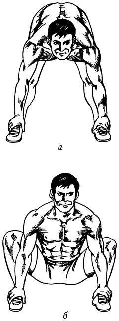 Поставьте ноги шире бедер, немного развернув носки в стороны, и чуть согните колени. Наклонитесь вперед и вцепитесь руками в лодыжки (рис. 30 а). Не отрывая рук от ног, выполняйте глубокие приседы (рис. 30, б), возвращаясь в исходное положение. Сделайте 1–2 сета из 8 повторов.