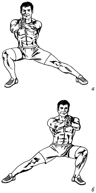 Поставьте ноги шире плеч, ступни расположите параллельно друг другу, таз отведите немного назад и вытяните руки перед собой. Согните правую ногу и опуститесь в боковой выпад (рис. 31, а). Из этого положения, не поднимаясь вверх, перекатитесь на другую ногу (рис. 31, б) и вернитесь обратно — это будет считаться одним повтором. Сделайте 2–3 сета по 8 повторов.