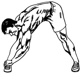 Поставьте ноги на ширину двух шагов, ступни параллельны друг другу. Повернитесь в сторону любой ноги и постарайтесь коснуться животом колена, руками вцепитесь в правую стопу (рис. 32). Немного постояв в таком положении, повернитесь в другую сторону.