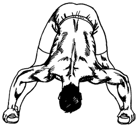 Из прежнего исходного положения наклонитесь прямо перед собой, взявшись за обе лодыжки руками. Для лучшего баланса постарайтесь коснуться макушкой пола (рис. 33).