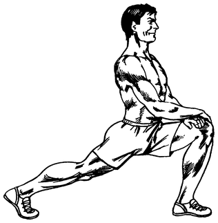 Сделайте длинный шаг вперед правой ногой, левую поставьте на носок. Упритесь руками в колено правой ноги, немного отклонитесь назад и старайтесь опуститься как можно ниже (рис. 34). Через нужный промежуток времени смените ногу.