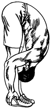 Поставьте ноги вместе и наклонитесь вперед. Возьмитесь за лодыжки и, помогая себе руками, постарайтесь корпусом коснуться ног (рис 38). Застыньте так на минуту, ноги не меняйте, разогнитесь и спокойно отдыхайте.