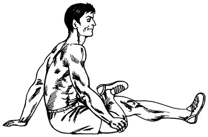 Ноги поставьте на ширину двух шагов, стопы прижаты к полу. Согните одну ногу. Обеими руками возьмитесь за ступни и с прямой спиной наклонитесь к прямой ноге (рис. 39). Не поднимаясь, поменяйте ноги, переместившись в другую сторону.