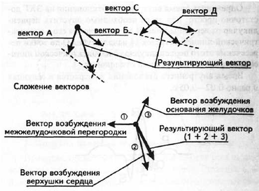 Несколько векторов могут суммироваться (по правилам векторного сложения) и результатом этой суммы будет являться один суммационный (результирующий) вектор. Например, если сложить три вектора возбуждения желудочков (вектор возбуждения межжелудочковой перегородки, вектор возбуждения верхушки и вектор возбуждения основания сердца), то мы получим суммационный (он же итоговый, он же результирующий) вектор возбуждения желудочков.