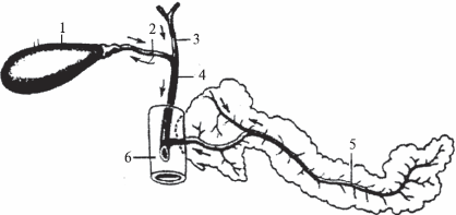 Стрелками показано направление движения секрета. 1 – желчный пузырь; 2 – пузырный проток; 3 – печеночный проток; 4 – общий желчный проток; 5 – проток поджелудочной железы; 6 – двенадцатиперстная кишка