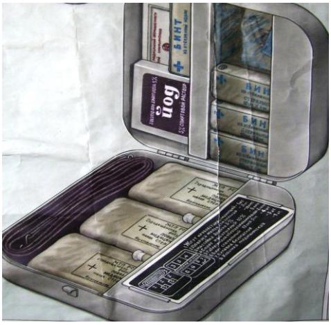 Содержит: антисептик (йод), раздражающее средство (аммиак), средство для обеззараживания воды («Пантоцид»), перевязочные средства (бинт марлевый стерильный, повязки медицинские малые, косынка медицинская), жгут кровоостанавливающий, булавки безопасные.