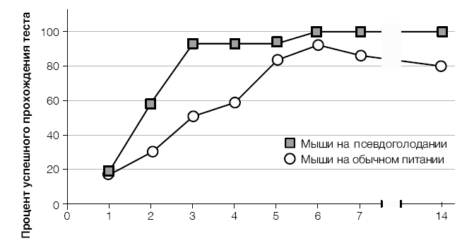 Во время другого исследования мы кормили уже взрослых мышей в соответствии с веганской версией псевдоголодания. При этом им давали низкокалорийную пищу только в течение четырех дней два раза в месяц (всего восемь дней). Несмотря на старение, эти мыши лучше обучались и запоминали информацию, чем мыши, которых кормили как обычно (Рис. 24). Тесты включали различные типы заданий, проверяющие, например, координацию (бег в колесе), или такие, во время которых требовалось использовать кратковременную и долговременную память. Результаты вновь доказывают, что питание имеет глубокое влияние на гены, играющие главную роль в процессе старения организма.