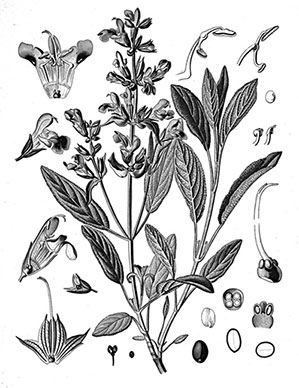 В листьях шалфея содержатся эфирные масла, дубильные вещества. Отвар листьев применяется для полоскания при зубной боли и для укрепления десен. Препараты из шалфея полезны при воспалительных болезнях горла, при ангине (например, в виде отвара с молоком).
