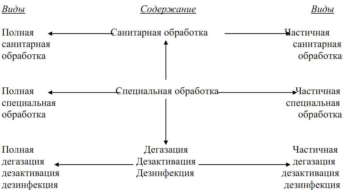 Под специальной обработкой (рис.17) понимается комплекс мероприятий, направленных на удаление и обезвреживание ОВ, РВ и БС с личного состава, вооружения, техники, транспорта, продовольствия, воды и других объектов внешней среды с целью уменьшения или предупреждения их поражающего действия на личный состав войск, в том числе медицинский состав, раненых и больных.