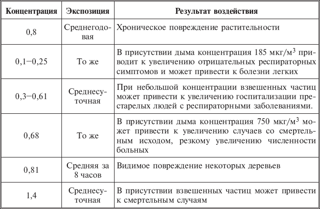 Влияние окислов серы на организм человека показано в табл. 2.