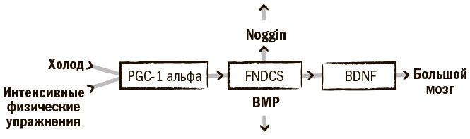 Ученым было известно о связи BDNF и физических упражнений, но только в 2013 году они обнаружили связь между BDNF и PGC-1 альфа. Оказалось, что увеличение уровня PGC-1 альфа стимулирует выработку FNDC5, что приводит к еще большему повышению BDNF[233]. Ничего удивительного, что процессы зарождения новых нейронов и митохондрий связаны между собой, но как же здорово знать, что простые физические упражнения позволяют создавать новые клетки мозга и митохондрии, чтобы снабжать их энергией.