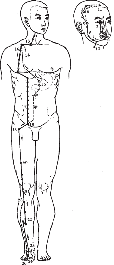 Точки меридиана Желудка влияют на лицо, нос, десны, горло, желудок, кишечник, на общее состояние психики.