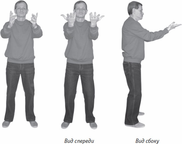 Руки вытянуть перед собой, ладони на уровне плеч и обращены друг к другу.