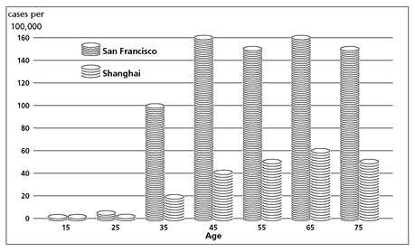 Рис. 7. Рак молочной железы (число случаев на 100 000 женщин) среди китайских иммигранток Сан-Франциско, по сравнению с китаянками, проживающими на родине (20). Рак — это болезнь западного образа жизни.