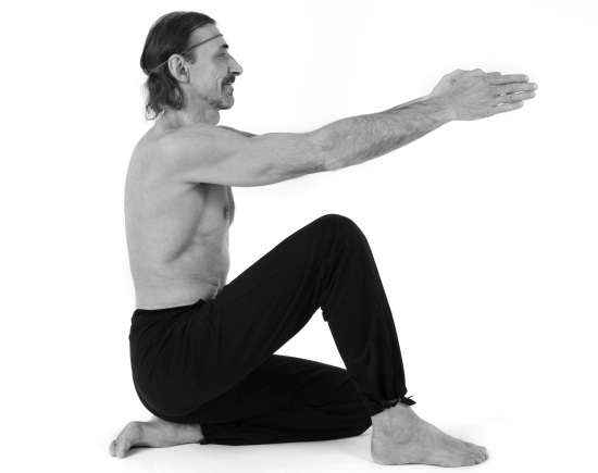 Исходное положение — уже знакомая вам ваджрасана: сидя ягодицами на пятках с выпрямленной спиной, ладони покоятся на коленях. Чтобы вам проще было сохранять прямое положение спины, представьте позвоночник в виде столбика из золотых монет — этот мыслеобраз очень помогает избавиться от горба во время выполнения асан.
