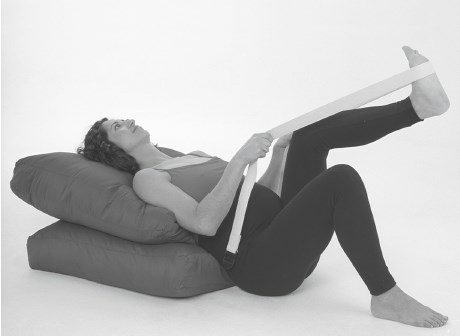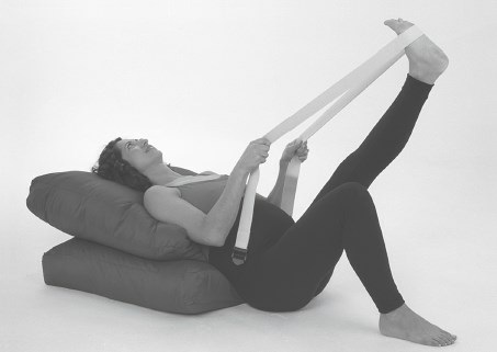 Адаптированный вариант Супта Падангустасаны. Лягте на пол, подложив под спину две подушки. Шею вытяните подальше от плеч. Поднимите левую ногу, согнув ее в колене. Когда бедро примет вертикальное положение, выпрямите ногу. Постарайтесь придать ноге положение, максимально близкое к вертикальному. Ухватитесь за ногу левой рукой там, где сможете, но по возможности как можно ближе к пятке. Альтернативный вариант: накиньте ремень на стопу и держите его концы левой рукой. Можно также держать ремень обеими руками, но не забывайте, что при этом плечи должны быть плотно прижаты к подушке. Можно также захватить ремнем нижнюю часть левой ноги. Правая же нога должна оставаться на полу в расслабленном состоянии. Мышцы шеи, тазовой области и брюшины также должны быть расслаблены. Оставайтесь в этой позе 10–15 секунд, дыхание ровное.