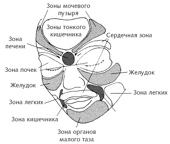 Периферия лба соотносится с толстым кишечником, а центральная часть лба – с тонким кишечником. От центра к вискам симметрично расходятся зоны мочевого пузыря, на висках расположены зоны селезенки, а на межбровье (точку судьбы, как говорят на Востоке) проецируется печень. Состояние печени и желчного пузыря также отражается на глазах, одно из ярких проявлений нарушений в области печени – желтушность склер. О проблемах с желчным пузырем свидетельствуют часто высыпающие красные прыщики на висках.
