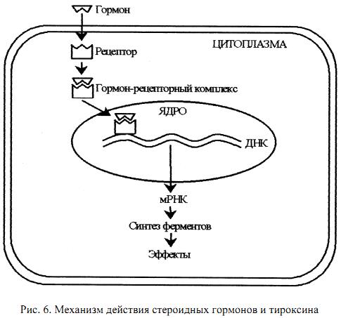 Рецепторы к этим гормонам находятся внутри клетки, в цитоплазме. Гормон легко и быстро проникает через мембрану внутрь клетки, взаимодействует с рецептором с образованием гормон-рецепторного комплекса. Этот комплекс переносится в ядро, где связывается с ядерным хроматином в определенном участке ДНК. С этого участка ДНК начинается синтез специфических мРНК, которые затем выходят в цитоплазму и служат матрицей для синтеза ферментов или других белков, необходимых клетке и обеспечивающих ответ клетки на действие гормона (рис. 6. .