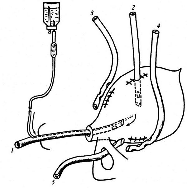 1 – уретральный двухходовой дренаж; 2 – эпицистостома; 3 – дренаж предпузырного пространства; 4 – надлобковый дренаж бокового и заднего околопузырного пространств; 5 – дренаж бокового и заднего околопузырного пространств через запирательное отверстие (по Мак–Уортеру–Буяльскому)
