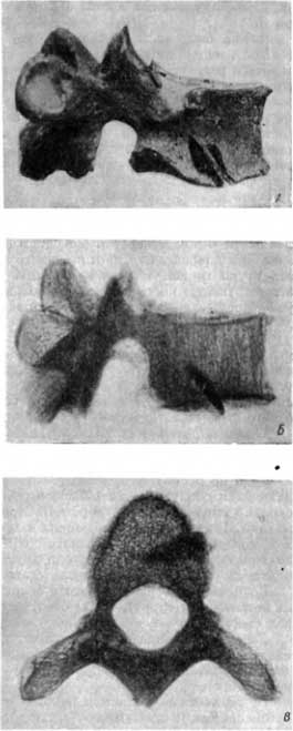 При врожденном срастании двух поясничных позвонков в верхнем из них произошел острый прорыв межпозвонкового диска (рис. 18, Б). В дальнейшем возник деформирующий спондилоз (из погребения в Саркеле).