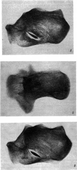 При раскопках в том же городище был обнаружен скелет женщины (возраст около 45 лет). В средней трети диафиза правой локтевой кости имелся перелом с исходом в ложный сустав (рис. 15, А и Б). Наступающие в этих случаях изменения на мацерированных костях редко описывались. В этом новообразованном суставе дистальный отломок кости играл роль головки; возникшая в области повреждения замыкающая пластинка была очень тонкой (как в нормальных головках). Поврежденная же поверхность проксимального отломка служила суставной впадиной. Возникшая на ней замыкающая пластинка была склерозированной (как в нормальных суставных впадинах). Необычные условия движения и нагрузка привели к преждевременному деформирующему артрозу в локтевом суставе. Кости правого предплечья в общем тоньше (атрофичнее) костей левого предплечья.