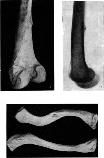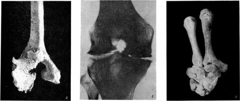 Рис. 17. А — последствия травмы локтевого сустава с обширным кровоизлиянием, своим давлением разрушившим дистальный эпифиз плечевой кости, деформирующий артрито-артроз; Б — исход травматического артрито-артроза или гемофилического поражения коленного сустава; В — анкилоз костей запястья и II и III пястных костей в результате обширного неудаленного кровоизлияния.