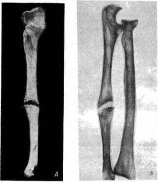 Рис. 15. А — ложный сустав в локтевой кости, возникший после перелома Б — рентгенограмма локтевой кости с ложным суставом и нормальной лучевой кости.