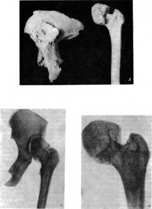 Рис. 16. А — старый вывих в тазобедренном суставе вверх и кзади, резко выраженный деформирующий артроз; Б — рентгенограмма с костей тазобедренного сустава, новообразованный сустав; В — дополнительная рентгенограмма с бедренной кости, хороню виден старый сросшийся перелом шейки бедра.