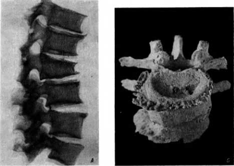 Рис. 18. А — компрессионный перелом тела II поясничного позвонка, острый прорыв межпозвонковых дисков в тела I и III поясничных позвонков; Б — врожденное срастание двух поясничных позвонков, острый прорыв межпозвонкового диска в тело верхнего позвонка.