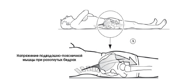 В некоторых случаях, находясь продолжительное время в положении лежа на спине, можно почувствовать дискомфорт в нижней части спины, который исчезает, как только мы согнем ноги в бедрах с опорой на ступни. При изменении положения нижних конечностей место прикрепления мышц-сгибателей приближается к точке начала (в основном это касается пояснично-подвздошных мышц), ослабляя напряжение своих структур и позволяя избежать смещения таза в сторону антеверсии (исчезает полость под поясницей) и одновременно снижая чрезмерное давление в дугоотростчатых суставах.