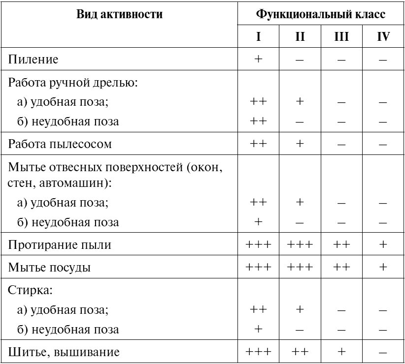 В специальной лаборатории Всесоюзного кардиологического научного центра, руководимого Е. И. Чазовым, под контролем ЭКГ, артериального давления и общего самочувствия ученые исследовали переносимость пациентами различных физических нагрузок и бытовых работ. Результаты исследований приведены в таблицах 2–4, благодаря которым больному можно подобрать нагрузку в зависимости от его функционального класса.