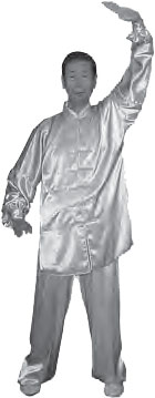Ноги прямые, стопы на ширине плеч. Поднять левую руку перед лицом, в позицию над головой слева, локоть слегка согнут. Пальцы направлены вправо. Сконцентрировать силу в нижней части поднятой ладони. Одновременно слегка приподнять правую руку, а затем поместить ее рядом с бедром, локоть слегка согнут, пальцы направлены вперед. Сила сосредоточена у основания правой ладони. Взгляд направлен прямо. Зафиксировать это положение (рис. 3–1).
