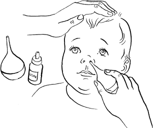 •Очень аккуратное (!) отсасывание слизи с помощью обычной спринцовки (клизмочки) или специального аспиратора поможет ребенку более спокойно дышать, спать и принимать пищу. Чтобы убрать затвердевшую слизь, перед отсасыванием ее нужно размягчить с помощью капель или специальных растворов, которые можно купить в аптеке без рецепта (рис. 457).