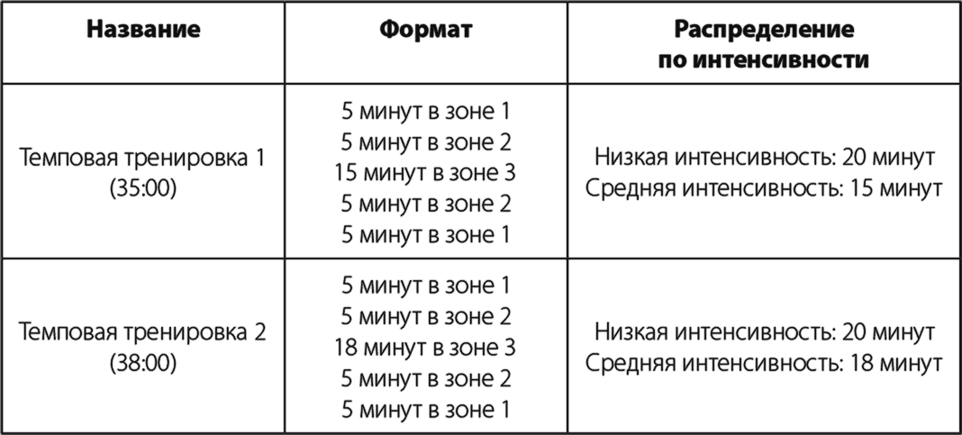 Темповая пробежка – это работа в зоне 3 с разминкой и заминкой. Это очень эффективное средство для повышения устойчивости к относительно агрессивной скорости. Темповые работы особенно важны в пиковом периоде при подготовке ко всем дистанциям от 5 км до марафона.