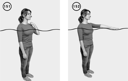 ИП – вертикально в воде. Руки согнуты в локтевых суставах, кисти сжаты в кулаки или пальцы сомкнуты вместе, чтобы не создавать большого сопротивления воды, расположены на уровне груди. Одновременно выпрямляете руки вперед, ладони обращены вниз, после чего возвращаетесь в исходное положение. Повторить движение 10–15 раз (ил. 149–150).