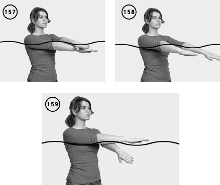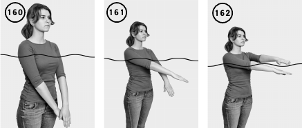 ИП – вертикально в воде, руки выпрямлены перед собой. Двигаете прямыми руками перед собой навстречу друг другу в противоположных направлениях. Кисти либо сжаты в кулаки, либо пальцы выпрямлены так, чтобы не создавать сопротивлению движению в воде. Повторить 10–15 раз (ил. 160–162).