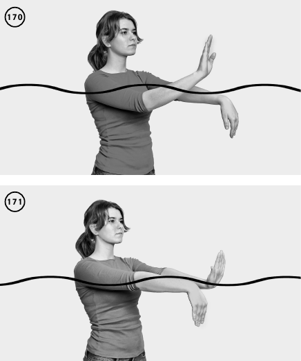 ИП – вертикально в воде. Руки выпрямлены в сторону в воде, кисти сжаты в кулаки. Одновременно поворачивайте сжатые кулаки вперед и вниз, при этом руки в локтевых суставах остаются выпрямленными. То есть происходит вращение в лучезапястных и плечевых суставах, почувствуйте растяжение мышц в этих областях. Удерживайте положение 5—20 секунд. После чего поверните кулаки обеих рук одновременно в противоположном направлении – вверх и назад. Также удерживайте крайнее положение 5—20 секунд. Повторите упражнение 1–3 раза. Это простое упражнение как на локтевые, так и плечевые суставы и задействует все мышцы обеих рук. Вы можете начинать растяжку рук именно с этого упражнения (ил. 146–147).