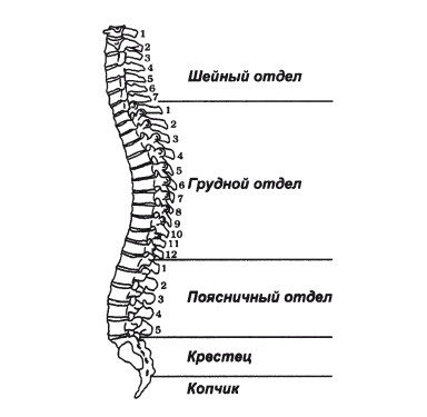 Позвоночник человека состоит из 33 позвонков, расположенных один-под другим, образующих вертикальный столб: 7 верхних позвонков называются шейными, следующие 12 – грудными (или торакальными), далее идут соединительные 5 позвонков – поясничные, затем 5 позвонков, сращенных в треугольную форму, – крестцовые и последние 4 – копчик (рис. 2).
