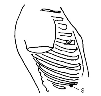 8. Цзин-мэнь («столичные ворота») расположена у свободного конца 12-го ребра (рис. 11, б). Она используется при всех болезнях почек и водного обмена (затрудненное мочеиспускание, помутнение мочи, отеки лица и конечностей).