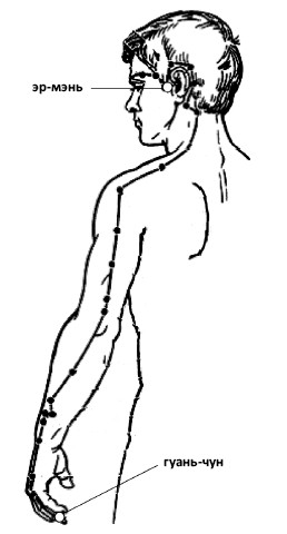 Воздействие на точку эр-мэнь на меридиане трех обогревателей совместно с точкой тин-гун меридиана тонкой кишки способствует похудению. А в походе или трудных условиях спасает от голода и жажды, если ее массировать пальцем. Точка гуань-чун (находится с внешней стороны безымянного пальца, у основания ногтевой пластины) – важнейшая точка, связанная с приобретением уверенности в интимной жизни человека. Она связана с половыми органами и сексуальной энергией.