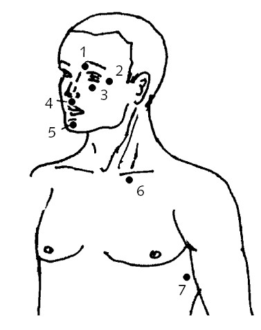 Точки 1 – на внутренних краях бровей. Уверенно барабаним по костям глазниц, с усилием приблизительно равным печатанию на пишущей машинке (чуть более интенсивно, чем на клавиатуре компьютера).