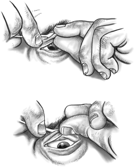 2. Глядя вниз, ухватите край века большим и указательным пальцем. Поскольку глаз направлен вниз, вы будете касаться его менее чувствительной части (белка). Ни в коем случае не дотрагивайтесь до глаза ногтем.