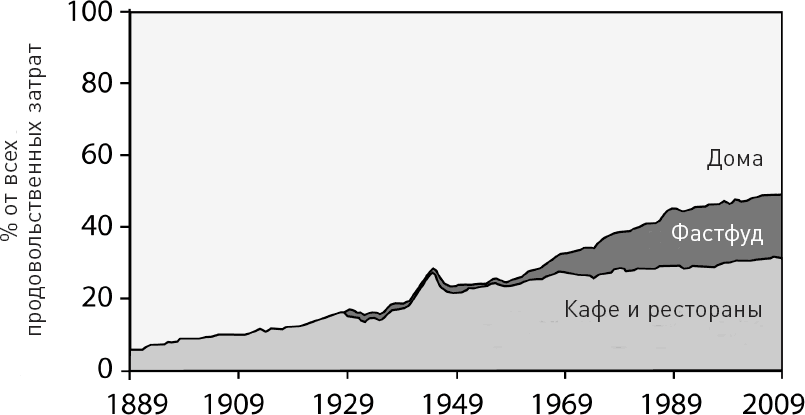 Рис. 17. График продовольственных расходов американцев на продукты для домашнего потребления, на посещение кафе и ресторанов и на фастфуд с 1889 по 2009 годы. Под категорию 2 – кафе и рестораны – попадают все продовольственные расходы, не связанные с двумя остальными категориями. Данные взяты из Службы экономических исследований при министерстве сельского хозяйства США.