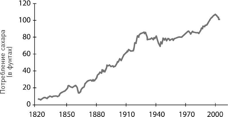 Рис. 18. Количество подсластителей в США на человека с 1822 по 2005 годы. Количество подсластителей изменяется в фунтах в год на человека. Данные скорректированы с учетом доли пищевых отходов (28,8 %). Данные взяты из Службы экономических исследований при министерстве сельского хозяйства и министерства торговли США. Особую благодарность я выражаю Джереми Ландену.