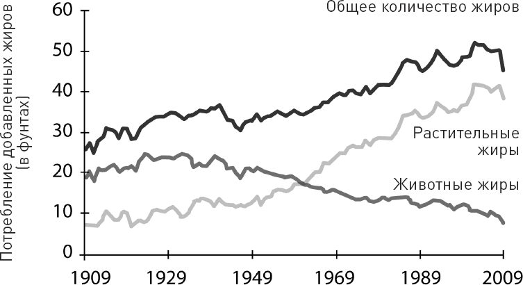 Рис. 19. Потребление добавленных жиров в США на человека в период с 1909 по 2009 годы. В категорию «животные жиры» включены сливочное масло, маргарин, сало и топленый жир. Информация о топленом жире начала поступать только 1979 году. В то время его очень мало использовали. В категорию растительных масел включены масла для жарки и заправки салатов, кондитерский жир и «другие пищевые жиры и масла». Информация получена из Службы экономических исследований при министерстве сельского хозяйства США. Данные скорректированы с учетом доли пищевых отходов (28,8 %).