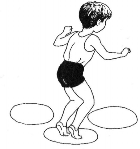 Подпрыгивания усложняются: при прыжках на месте ребенок может совершать дополнительные движения ногами (ноги скрестно, с ноги на ногу), прыгать на одной ноге, с поворотом в прыжке. Подпрыгивая, ребенок может продвигаться вперед, боком — в сторону, через линию, из кружка — в кружок (рис. 140).