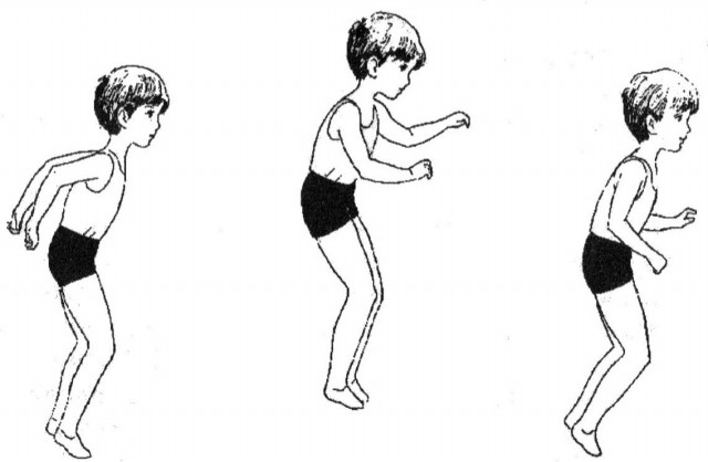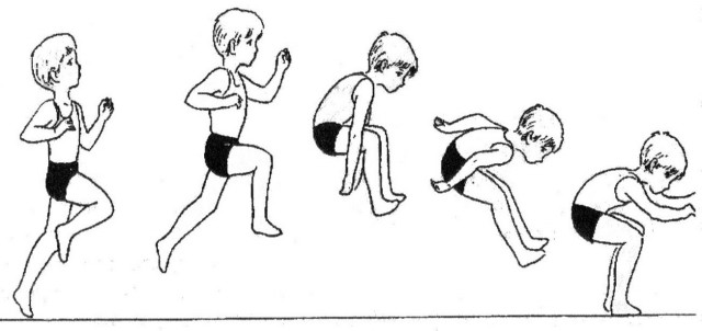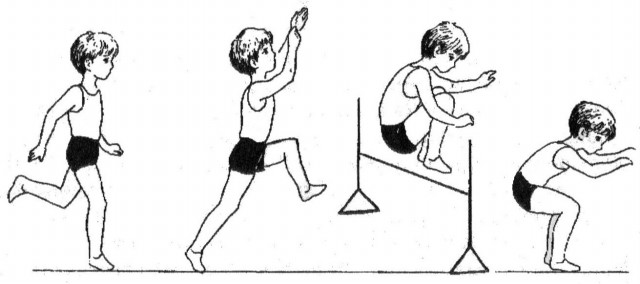 При прыжках в высоту сохраняется вышеописанная последовательность движений, только в момент полета ребенок группируется.