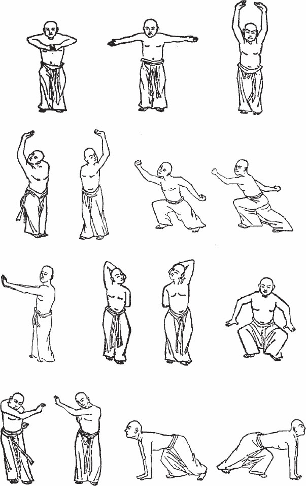 Придя в Шаолиньский монастырь в 520 г., Бодхидхарма обнаружил, что монахи слишком слабы для серьезных занятий медитацией, необходимых для достижения просветления. Их тогдашние наставники были уверены, что в духовной практике самым важным является сознание, а о теле (иногда его именовали «зловонным мешком») особенно заботиться нет необходимости. Бодхидхарма же считал, что основой духовного развития является физическая крепость. С целью укрепления тела он обучил шаолиньских монахов двум комплексам оздоровительных упражнений:
