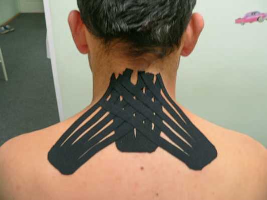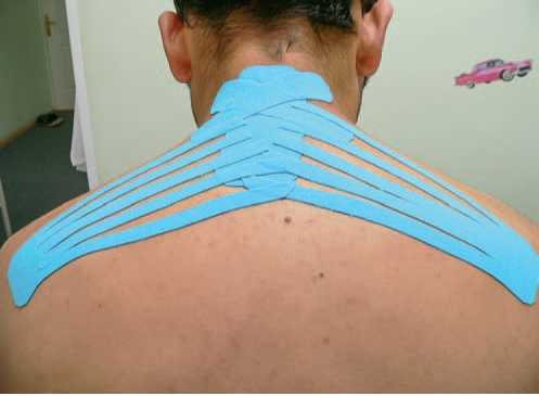 Через четыре дня каждодневной реабилитации с использованием КСТ и Войта-терапии было проведено повторное тейпирование с усилением воздействия (рис. 92). Уменьшение клинических проявлений и динамика в целом за эти четыре дня лишний раз подтвердили наличие нестабильности и слабости шейного отдела позвоночника, выраженный компрессионный синдром, ВЧД и др.